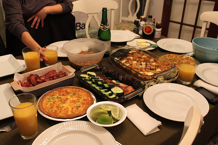 So what do we do on weekends? Host gatherings that revolve around food, of course. One of the most recent ones we had was a breakfast for dinner potluck. We had mimosas, biscuits, quiche, french toast casserole with cream cheese, salmon teriyaki, a Spanish tortilla, white sweet potato home fries, fried rice, and Nutella scones.